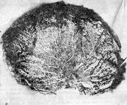 б — стадия образования мелкопетлистой артериальной сети. Видны центральная вена (в) и ветвь средней мозговой артерии (А). Артерии белые, вены черные. Инъекционный препарат. Х2Х8;