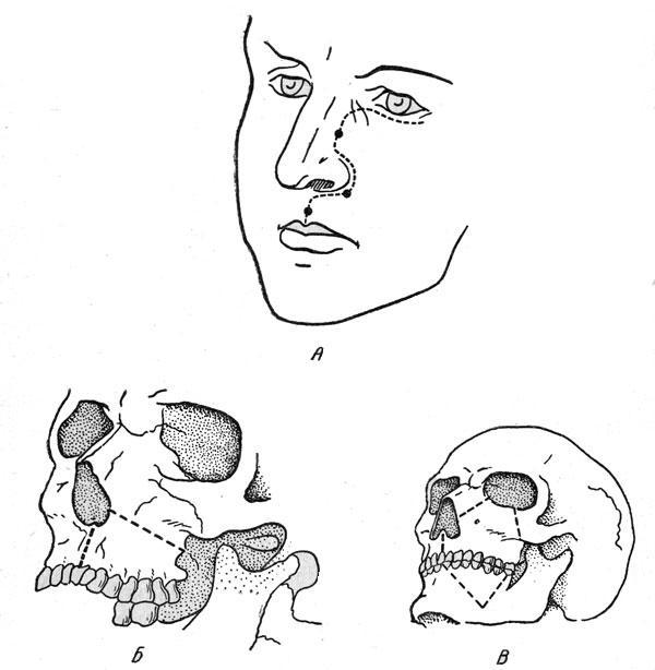 А — линия рассечения мягких тканей (при частичной резекции разрез в подглазничной области можно не производить),