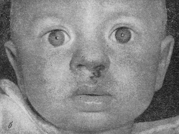 Пластика верхней губы: а — ребенок до операции, б — ребенок после операции — до снятия швов.