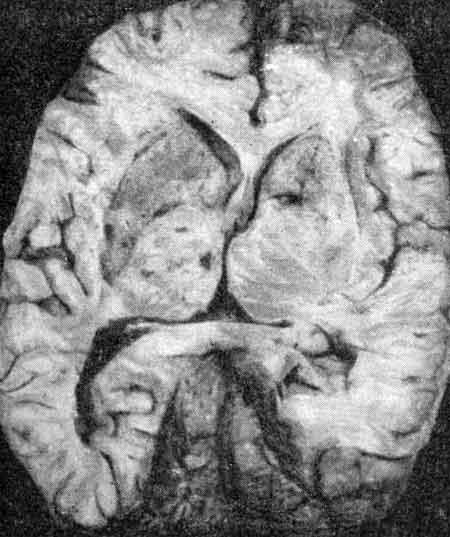 Обширное размягчение в лобных и височной доле мозга вследствие тяжелого поражения магистральных сосудов на основании мозга. Больной 8 лет, смерть на 96-й день болезни.